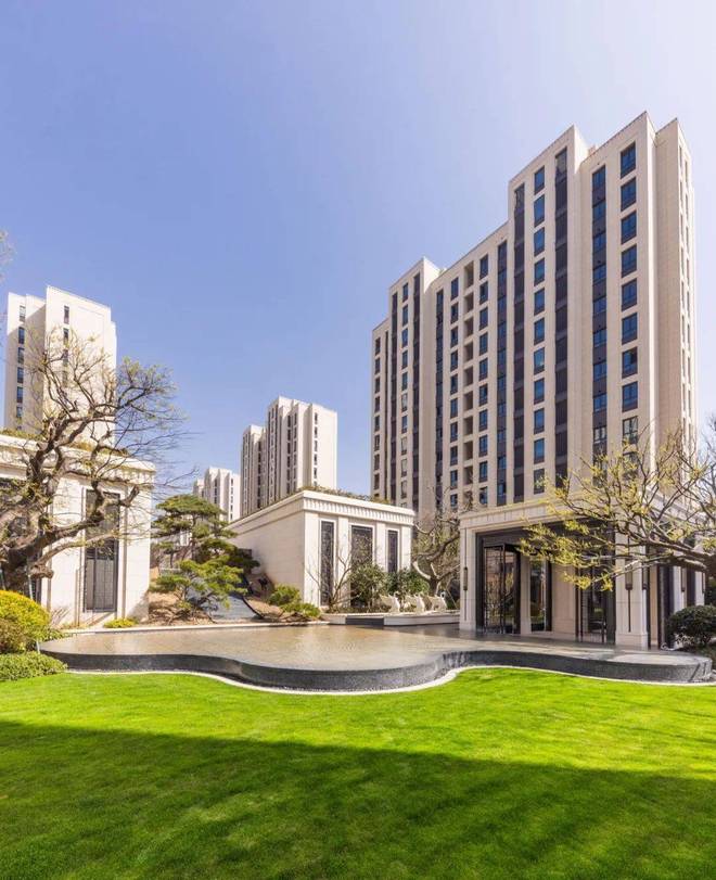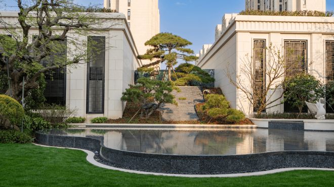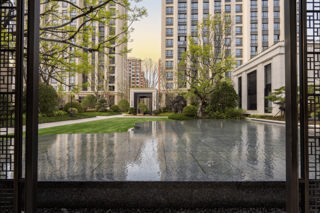 园林也不再是“绿化率”的堆砌,而是借鉴中式园林的“移步换景”,廊架、水景、雕塑、树木、草坪错落其间,含蓄又静谧。