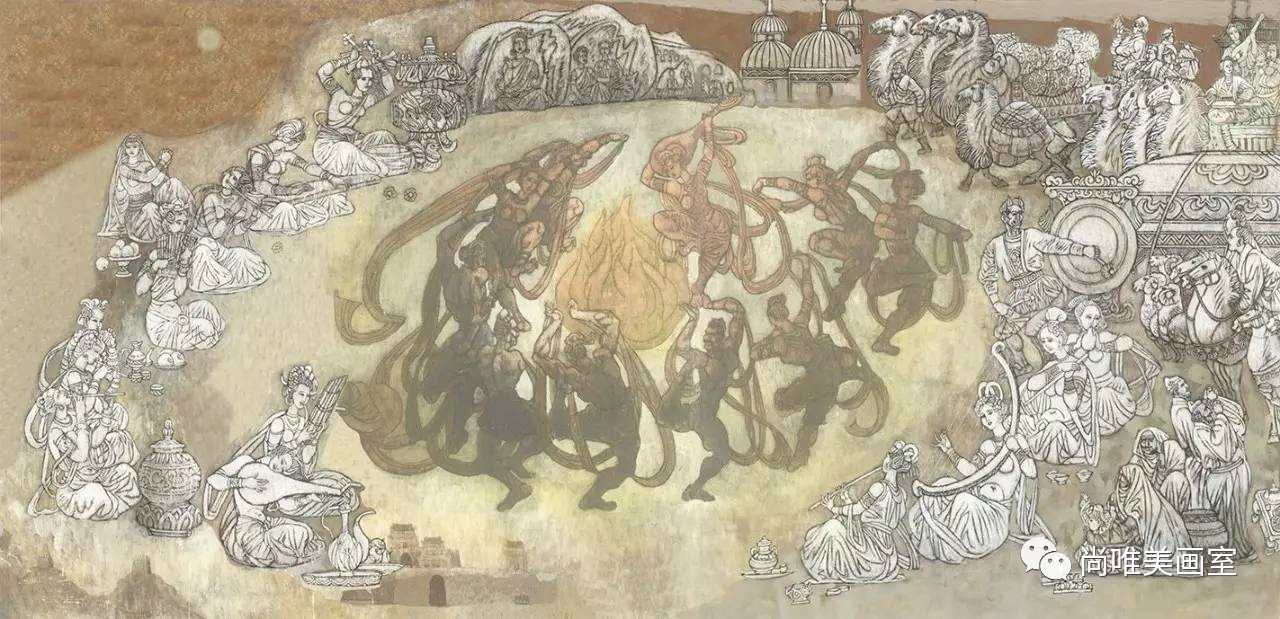 本次展览分速写/写生、主题创作、重彩绘画、水墨写意四大部分,展现了他严肃、认真的探索精神,坚实全面的绘画功夫,以及写意水墨的逐步提升,是对丝绸之路文化精神的多角度阐释。恰逢“一路一带国家战略”的实施,这个展览表现出的前瞻性将给我们以启示。